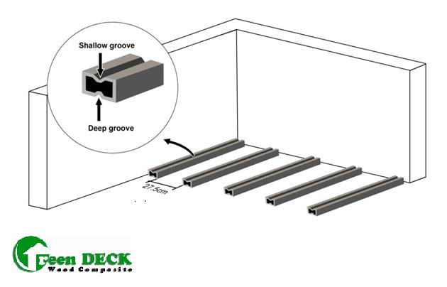 2. Lắp đặt cố định thanh khung xương xuống sàn bằng vít nở nhựa,dọc theo chiều thoát nước đã được thiết kế. Khoảng cách giữa các thanh từ 27-30cm