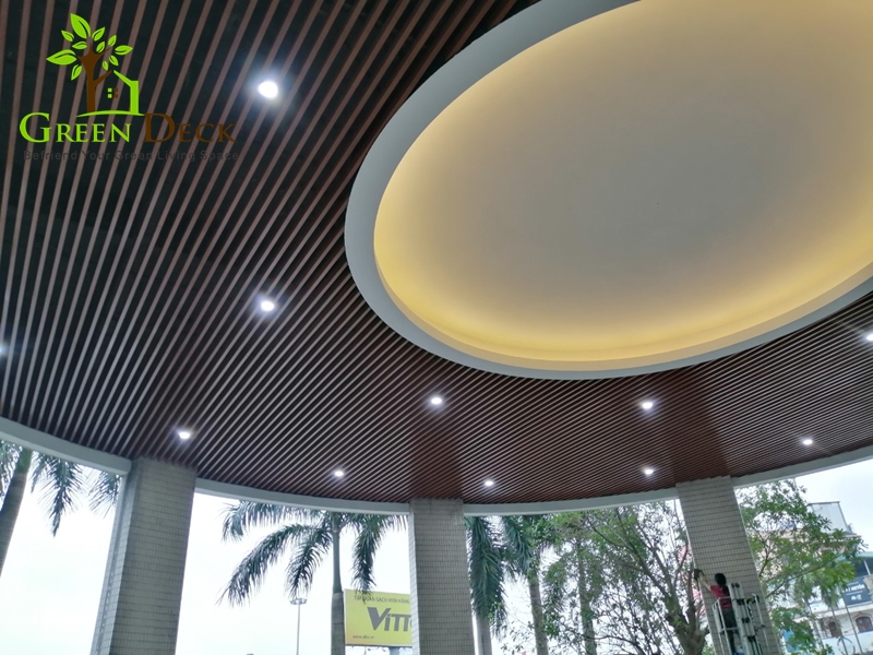 Lam gỗ nhựa trang trí sảnh khách sạn cao cấp, văn phòng hạng A luôn mang đến không gian sang trọng, thư giãn, gần gũi và thân thiện. Lam gỗ nhựa thi công được cả những mảng tường - trần có thiết đặc biệt như giật cấp, lồi nõm hay góc cạnh, tất nhiên với mảng tường trần này sẽ yêu cầu đội ngũ kỹ thuật thi công có bề dày kình nghiệm cũng như tay nghề.
